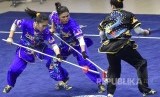Atlet Wushu DI Yogyakarta Angela Louis Radetiya (kiri), Kamilla Utuhayu (tengah) dan Felicia Alverina Monindra memperagakan jurus nomor Duilian Putri PON XIX. (FOTO : Antara/Wahyu Putro)