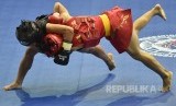 Atlet wushu putri Sumut Junita Malau (kiri) berusaha membanting lawannya atlet wushu Jambi Friska Ria Wibowo pada final nomor Sanda Putri 48 kg PON XIX. (FOTO : Antara/Wahyu Putro)