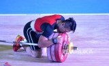 Lifter Jabar Deni mencium beban usai bertanding pada kelas 69 Kg setelah meraih emas pada kelas 69kg Putra dengan total angkatn 328kg (FOTO : Republika/Prayogi)