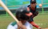 Pelempar (Pitcher) Bali Soraya Nur Effendy (kanan) melempar bola ke arah pemukul (batter) Kaltim Heru Pradana (kiri) saat babak penyisihan bisbol PON XIX. (FOTO : Antara/Prasetyo Utomo)