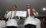 Bakal Calon Gubernur DKI Anies Baswedan (kanan) dan Bakal Cawagub Sandiaga Uno (kiri) menunjukan dokumen pendaftaran di KPUD DKI Jakarta, Jumat (23/9) malam. (FOTO : Republika/Raisan Al Farisi)