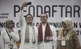 Bakal Calon Gubernur DKI Anies Baswedan (kedua kanan) dan Bakal Cawagub Sandiaga Uno (kedua kiri) didampingi istri berswafoto usai menyerahkan dokumen pendaftaran kepada pimpinan KPUD DKI saat pendaftaran di KPUD DKI Jakarta, Jumat (23/9) malam. (FOTO : Republika/Raisan Al Farisi)