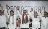Bakal Calon Gubernur DKI Anies Baswedan (tengah) dan Bakal Cawagub Sandiaga Uno (kedua kiri) didampingi pimpjnan partai mengangkat tangan seusai menyerahkan dokumen pendaftaran kepada pimpinan KPUD DKI saat pendaftaran di KPUD DKI Jakarta, Jumat (23/9) mal (FOTO : Republika/Raisan Al Farisi)