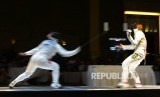 Atlet Anggar Sumatera Selatan Ricky Dhisulimah (kiri) melawan Atlet Anggar Jawa Barat Idon Jaya Wiguna (kanan) dalam final kategori nomer Sabre Perorangan Putra PON XIX di Bandung, Jawa Barat, Jumat (23/9). (FOTO : Republika/Rakhmawaty La'lang)