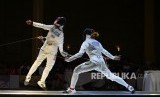 Atlet anggar Kalimantan Barat Verdiana Rihadini(kiri) bertanding melawan atlet anggar Kaltim Chintya AnreinyPua (kanan) dalam final nomor floret perorangan putri PON XIX di Bandung, Jawa Barat, Jumat(23/9). (FOTO : Republika/Rakhmawaty La'lang)