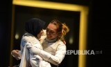 Atlet anggar Kalimantan Barat Verdiana Rihadini(kiri) dan atlet anggar Kaltim Chintya AnreinyPua (kanan) berpelukan usai bertanding dalam final nomor floret perorangan putri PON XIX di Bandung, Jawa Barat, Jumat(23/9). (FOTO : Republika/Rakhmawaty La'lang)