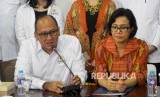 Ketua KadinIndonesia Rosan Perkasa Roeslani (kiri) bersama anggota Kadin Sandiaga Uno (ketiga kanan) saat menyampaikan surat pernyataan harta (SPH) didampingi Menteri Keuangan Sri Mulyani (tengah) serta Direktur Jendral Pajak Ken Dwijugiasteadi (FOTO : Republika/Agung Supriyanto)