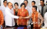 Ketua Umum Kamar Dagang dan Industri (Kadin) Indonesia Rosan Perkasa Roeslani (kiri) berfoto bersama Menteri Keuangan Sri Mulyani (tengah) serta Direktur Jendral Pajak Ken Dwijugiasteadi (kedua kanan saat menyampaikan surat pernyataan harta (SPH) (FOTO : Republika/Agung Supriyanto)