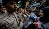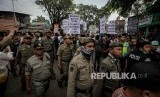 Polisi Pamong Praja melintasi warga yang berunjukrasa jelang penggusuran permukiman yang terkena proyek normalisasi Sungai Ciliwung, Bukit Duri, Jakarta, Rabu (28/9). (FOTO : Republika/Raisan Al Farisi)