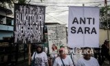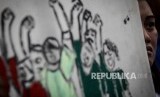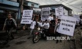Sejumlah warga melakukan aksi jelang penggusuran permukiman yang terkena proyek normalisasi Sungai Ciliwung, Bukit Duri, Jakarta, Rabu (28/9) (FOTO : Republika/Raisan Al Farisi)