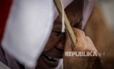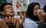 Seorang warga menangis saat melakukan aksi jelang penggusuran permukiman yang terkena proyek normalisasi Sungai Ciliwung, Bukit Duri, Jakarta, Rabu (28/9) (FOTO : Republika/Raisan Al Farisi)