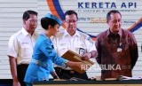 Dirut PT Kereta Api Indonesia (KAI) Edi Sukmoro (tengah) , Direktur Keuangan KAI Didiek Hartantyo dan Direktur Corporate Banking Bank Mandiri Royke Tumilaar (dari kiri) saat melakukan penandatanganan kerjasama di Bandung, Jawa Barat, Rabu (28/9). (FOTO : Republika/ Tahta Aidilla)