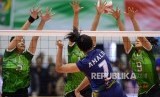 Pemain bola voli Putri Jawa Barat Yolla Yuliana (kedua kiri) dan Agustin Wulandhari (kedua kanan) berusaha memblok smes yang dilancarkan tim bola voli Jatim Novi Antriayanti (ketiga kiri) dan Bunga Mitasari (kanan) pada final PON XIX di Gelora Sabilulungan (FOTO : Republika/Rakhmawaty La'lang)