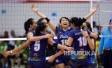 Pemain bola voli Putri Jawa Barat mengekspresikan kegembiraan usai mencetak angka pada melawan tim bola voli Jatim pada final PON XIX di Gelora Sabilulungan, Kompleks Stadion Si Jalak Harupat, Kabupaten Bandung, Jabar, Rabu (28/9). (FOTO : Republika/Rakhmawaty La'lang)