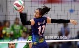 Pemain bola voli Putri Jawa Barat Amalia Fajrina Nabila melakukan smash saat melawan tim bola voli Jatim pada final PON XIX di Gelora Sabilulungan, Kompleks Stadion Si Jalak Harupat, Kabupaten Bandung, Jabar, Rabu (28/9). (FOTO : Republika/Rakhmawaty La'lang)
