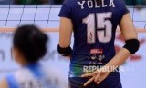 Pemain bola voli Putri Jawa Barat Yolla Yuliana memberikan tanda isyarat saat melawan tim bola voli Jatim pada final PON XIX di Gelora Sabilulungan, Kompleks Stadion Si Jalak Harupat, Kabupaten Bandung, Jabar, Rabu (28/9). (FOTO : Republika/Rakhmawaty La'lang)