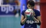 Pemain bola voli Putri Jawa Barat Yolla Yuliana bersiap melakukan service saat melawan tim bola voli Jatim pada final PON XIX di Gelora Sabilulungan, Kompleks Stadion Si Jalak Harupat, Kabupaten Bandung, Jabar, Rabu (28/9). (FOTO : Republika/Rakhmawaty La'lang)