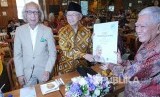 Prof Soekirman menyerahkan mockup buku kepada mantan Menteri Bappenas JB Sumarlin pada peluncuran buku Gizi Untuk Bangsa (FOTO : Republika/Yogi Ardhi)