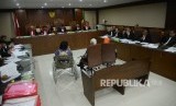 Suasana sidang terdakwa kasus suap dana hibah sekaligus Mantan Ketua Kamar Dagang dan Industri (Kadin) Jawa Timur La Nyalla Mahmud Mattalitti dengan agenda mendengarkan keterangan saksi di Pengadilan Tindak Pidana Korupsi (Tipikor), Jakarta, Rabu (5/10). (FOTO : Republika/ Raisan Al Farisi)