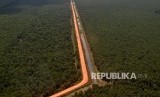 Jalan baru membelah kawasan hutan industri yang akan menjadi bahan baku bubur kertas (FOTO : Republika/Maspril Aries)