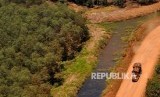 Truk pengangkut batang kayu melintasi hutan industri Desa Bukit Batu, Kecamatan Air Sugihan, Kabupaten Ogan Komering Ilir (OKI), (FOTO : Republika/Maspril Aries)