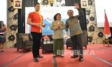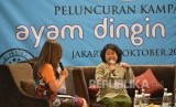 Sesdirjen Peternakan dan Kesehatan Hewan Kementan RI Dr Ir Riwantoro (kanan) Direktur Kesmavet Kementan Sri Muhartini dan Duta Kampanye Ayam Dingin Segar Edwin Lau bercakap-cakap di sela peluncuran Kampanye Konsumsi Ayam Dingin Segar di Jakarta, Kamis (6/1 (FOTO : Republika/Yogi Ardhi )