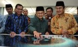 Presiden RI Ke 3 BJ Habibie (tengah), Dirut BRI Asmawi Syam (kiri) dan Ketua ICMI Jimly Assidiqie (dari kiri) melihat Smart Table saat mengunjungi BRI Digital Banking di Terminal 3 Ultimate bandara Soekarno Hatta, Tangerang, Banten, Kamis (6\10). (FOTO : Republika/ Tahta Aidilla)