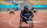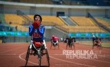 Atlet dalam cabang Atletik dari Jabar, Teguh Priyanto menyentuh garis finish pada nomor nomor lomba kursi roda 400 M klasifikasi T53 Putra Peparnas XV di Stadion Gelora Bandung Lautan Api,Bandung Ahad (16/10). Dalam pertandingan tersebut, Teguh meraih em (FOTO : Republika/Raisan Al Farisi)
