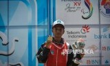 Atlet Paralympic Lari asal Bangka Belitung Azwar Saputra mengigit medali emasnya usai menyelesaikan final lari 5000 meter klasifikasi T+54 putra Peparnas XV di Stadion Gelora Bandung Lautan Api, Bandung, Minggu (16/10). Azwar Saputra berhasil meraih medali (FOTO : Republika/Raisan Al Farisi)