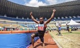 Atlet Paralympic Lompat Tinggi asal Papua Dapie Bayage melakukan selebrasi usai menyelesaikan lompatan pada final lompat tinggi klasifikasi F42 putra di Stadion Gelora Bandung Lautan Api, Bandung, Minggu (16/10). Dapie Bayage berhasil meraih medali emas se (FOTO : Antara/Muhammad Adimaja)