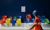 Pekerja melintas di dekat contoh bangku yang akan digunakan untuk tribun Stadion Utama Gelora Bung Karno (GBK), Jakarta, Selasa (18/10). (FOTO : Republika/Prayogi)