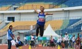 Atlet lompat jangkit F47 putra yang berasal dari Kalimantan Selatan Setyo Budi Hartono menjalani final lomba lompat jangkit dalam perhelatan Pekan Paralimpik Nasional (Peparnas) XV (FOTO : Republika/Raisan Al Farisi)