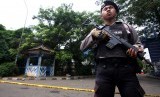 Anggota kepolisian berjaga di lokasi penyerangan brutal dengan senjata tajam terhadap anggota kepolisian di Cikokol, Tangerang, Banten, Kamis (20/10). (FOTO : Antara/Muhammad Iqbal)
