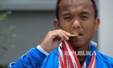 Atlet renang gaya dada tuna daksa klasifikasi S6 dari Provinsi Jawa Tengah Toif Fauzi menggigit medali emas setelah bertanding dalam perhelatan Pekan Paralimpik Nasional (Peparnas) yang diadakan di Kolam Renang Universitas Pendidikan Indonesia (UPI), (FOTO : Republika/Raisan Al Farisi)