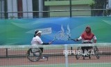 Atlet tenis kursi roda ganda putri Jabar Laely Yuntari dan Naila savitri melakukan tos usai mendapatkan poin melawan tim petenis Kaltim saat pertandingan final tenis ganda putri pada Pekan Paralimpik Nasional XV. (FOTO : Republika/Raisan Al Farisi)