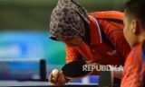 Atlet tenis meja difabel ganda campuran dari DKI Jakarta Komet (kanan) dan Shella (kiri) melakukan servis saat bertanding melawan atlet dari Jawa Barat Aminah dan Lukman saat laga final dalam perhelatan Pekan Paralimpik Nasional (Peparnas) XV yang diadakan (FOTO : Republika/Raisan Al Farisi)