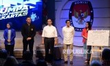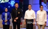 Pasangan Cagub dan Cawagub DKI Anies Baswedan dan Sandiaga Uno saat diskusi yang dipandu oleh Ronald Surapradja (kiri) dan Rahma Sarita pada peluncuran Jumpa Calon Pemimpin Jakarta di Studio Jak TV, Jakarta, Jumat (21/10). (FOTO : Republika/Wihdan Hidayat)
