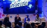 Pasangan Cagub dan Cawagub DKI Agus Harimurti Yudhoyono dan Silvyana Murni saat diskusi yang dipandu oleh Ronald Surapradja (kiri) dan Rahma Sarita pada peluncuran Jumpa Calon Pemimpin Jakarta di Studio Jak TV, Jakarta, Jumat (21/10) (FOTO : Republika/Wihdan Hidayat)