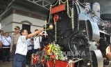 Direktur Komersial dan IT PT KAI, M Kuncoro Wibowo menandai pengoperasionalan kembali loko antik B 2503 di Stasiun Ambarawa, Kabupaten Semarang. (Republika/Bowo Pribadi) (FOTO : Republika/Bowo Pribadi)