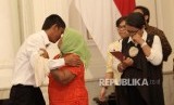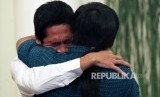 WNI korban penyanderaan perompak Somalia asal Medan, Sudirman memeluk anggota keluarganya saat bertemu pada acara serah terima sandera Somalia di Kementerian Luar Negri, Jakarta, Senin (31/10). (Republika/Rakhmawaty La'lang) (FOTO : Republika/Rakhmawaty La'lang)