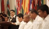 Menteri Luar Negeri Retno Marsudi menyampaikan pandangannya pada acara serah terima sandera Somalia di Kementerian Luar Negri, Jakarta, Senin (31/10). (Republika/Rakhmawaty La'lang) (FOTO : Republika/Rakhmawaty La'lang)