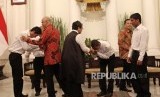 Menteri Luar Negeri Retno Marsudi (tengah) bersama WNI korban penyanderaan perompak Somalia pada acara serah terima sandera Somalia di Kementerian Luar Negri, Jakarta, Senin (31/10). (Republika/Rakhmawaty La'lang) (FOTO : Republika/Rakhmawaty La'lang)