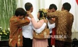 Ekspresi haru Menlu Retno Marsudi (kanan) saat menyaksikan pertemuan WNI korban penyanderaan perompak Somalia bertemu dengan keluarganya di Kementerian Luar Negri, Jakarta, Senin (31/10). (Republika/Rakhmawaty La'lang) (FOTO : Republika/Rakhmawaty La'lang)