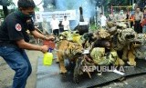 Anggota LSM lingkungan hidup menyemprotkkan bahan bakar pada offset satwa pada pemusnahan barang bukti 38 jenis satwa dilindungi yang telah diawetkan di Mapolrestabes Bandung, Jalan Merdeka, Kota Bandung, Selasa (1/11). (Republika/Edi Yusuf)