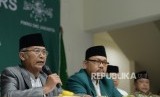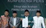 Rois Syuriyah PWNU Jakarta Mahfudz Asirun (tengah) bersama Wakil Ketua Tanfidziyah Samsul Maarif (kedua kiri) menyampaikan pernyataan sikap PWNU Jakarta terkait Aksi Massa pada 4 November mendatang. (Republika/Wihdan) (FOTO : Republika/ Wihdan )