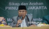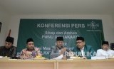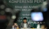 Rois Syuriyah PWNU Jakarta Mahfudz Asirun memberikan pernyataan sikap PWNU Jakarta terkait Aksi Massa pada 4 November mendatang di Jakarta, Rabu (2/11). (Republika/Wihdan) (FOTO : Republika/Wihdan)
