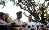 Utusan Aksi Damai 4 NOvember Bachtiar Nasir (dari kiri), Muhammad Zaitun Rasmin, dan Misbahul Anam ditemani Kadiv Humas Polri Boy Rafly Amar (kanan) menunggu bertemu dengn perwakilan Pemerintah di Istana Merdeka, Jakarta, Jumat (4/11). (FOTO : Republika/Wihdan Hidayat)