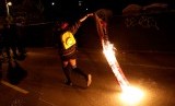 Seorang pengunjuk rasa berlari sambil membawa bendera yang terbakar saat aksi unjuk rasa menentang kemenangan Presiden AS terpilih Donald Trump di Oakland, Kalifornia. (FOTO : REUTERS/Stephen Lam)