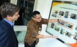 Corporate Secretary Biofarma, M Rahman Rustan menjelaskan alur produksi pada Martin Eisenhawer dari WHO pada penutupan Workshop Manajemen Industri Vaksin di Bio Farma, Kota Bandung, Kamis (17/11). (FOTO : Republika/Edi Yusuf)