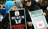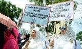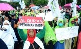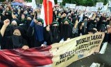 Peserta perempuan membawa bermacam poster pada Apel Akbar Muslim Jawa Barat di depan Gedung Sate, Kota Bandung, Jumat (18/11). (FOTO : Republika/Edi Yusuf)